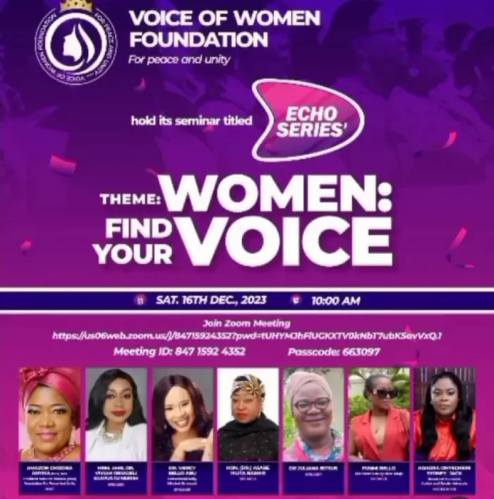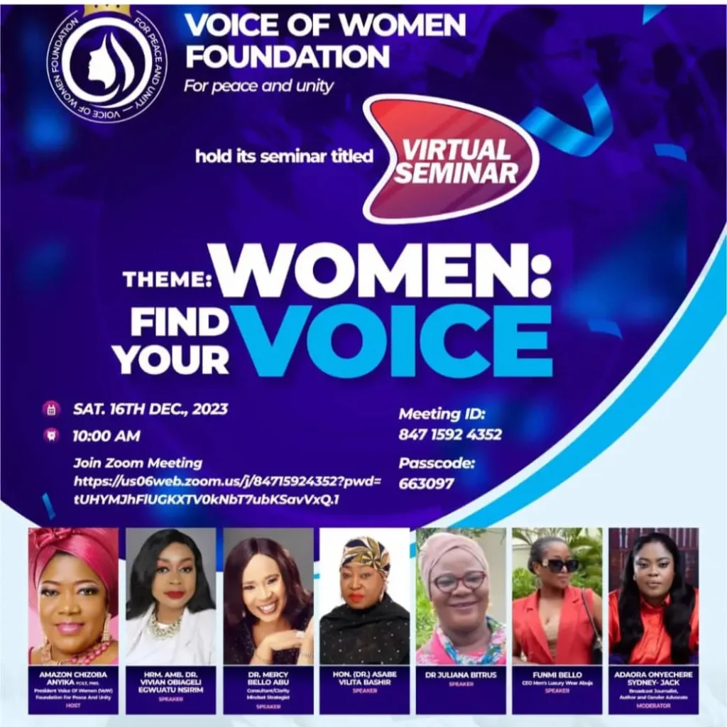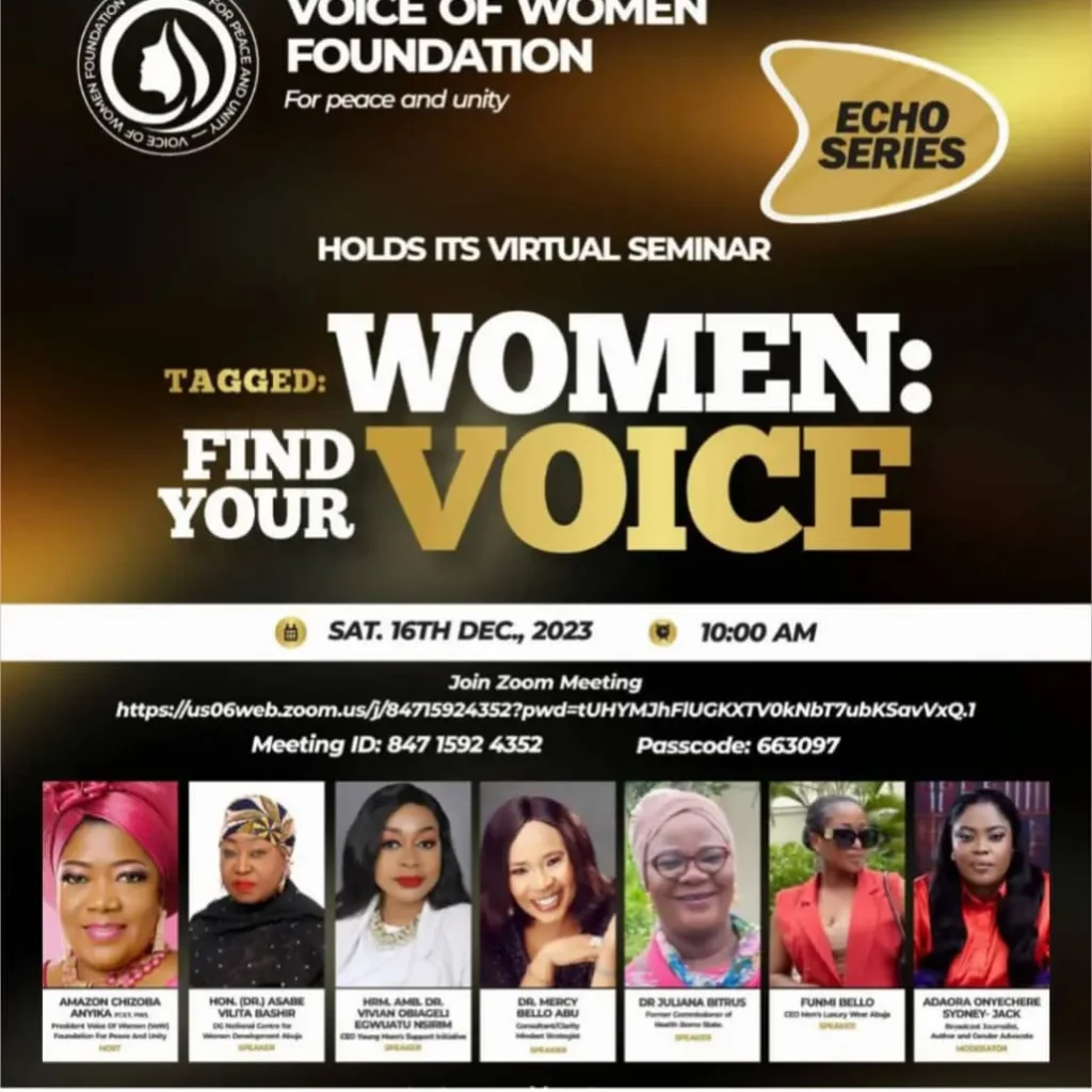 The Voice of Women Foundation for Peace and Unity is a non-profit organization that aims to promote gender equality, peace, and unity. The foundation focuses on empowering women and girls to become agents of change in their communities, promoting peaceful conflict resolution, and fostering unity among diverse groups.